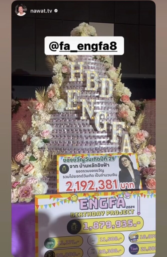 ล่าสุดงานปาร์ตี้วันเกิดด้อมก็ไม่เคยน้อยหน้าเช่นเคย เล่นใหญ่แบบสุดๆ จัดเต็มเปย์ซุ้มเงินสุดยิ่งใหญ่มูลค่าร่วมหลายล้านบาท สมแล้วกับตำแหน่งขวัญใจมหาชน ซึ่งงานนี้อิงฟ้า ก็ไม่พลาดออกมารีโพสต์และแชร์ลงในไอจีสตอรี่ส่วนตัว